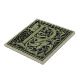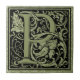 Charming decorative letter P initial monogram. Calligraphy style typography. William Morris first letter in black over vintage avocado green book lining with off white Ginkgo biloba leaves.