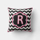 Letter R. Pretty monogram (single inital) throw pillow. Bold black and white zigzag (chevron) stripes, with white and fuchsia detailing and a single initial in the centre.