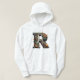 The design is a vibrant and festive representation of Thanksgiving, combining seasonal autumn elements with a playful cartoon turkey. At the heart of the image, the letter "R" stands out, adorned with vibrant leaves, pumpkins, and acorns, evoking a delicate autumnal atmosphere. Beside the letter stands a charming cartoon turkey, adding a touch of fun and personality to the design.