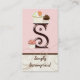Letter S Monogram Custom Business Cards for your cupcake or other bakery business. Sweet and Contemporary! This business card design features three hand painted cupcakes in chocolate brown and soft pink and cream. The Monogram Letter is in “chocolate” and will appeal sweet lovers everywhere! The background is a soft shell pink with latte coloured swirls over a cream crackle finish and a chocolate brown stripe. This design is perfect for your wedding shower, bridal shower or for businesses such as wedding coordinators, event planners, bakeries, bake shops, custom wedding cake designers, speciality cupcake services and more. Every letter of the alphabet is available, if you don't see what you want just email us!