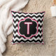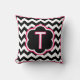 Letter T. Pretty monogram (single inital) throw pillow. Bold black and white zigzag (chevron) stripes, with white and fuchsia detailing and a single initial in the centre.