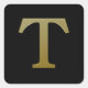 Gold capital letter T in faux gold bronze font. Metallic look achieved using highlights and shadows in yellow, brown and grey tones. Set on solid black and can be customised with the background colour of your choice.
