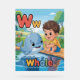 Cute and colorful alphabet poster featuring the letter W with a friendly smiling whale and a cheerful child illustration.