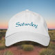 Lettering, embroidery on a hat. Suggestion: white hat with light blue lettering. Black hat might work too.