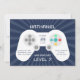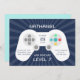 Cool gamer theme birthday party invitations feature a video game controller with "[name] has reached level [age]" displayed in retro lettering, with your party details on the game controller.