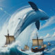 Leviathan’s Flight to Freedom – Surreal Whale Art. In a churning maelstrom of water and human ambition, a massive whale makes its escape. The surrounding ships, symbols of confinement, struggle to contain a force far beyond their control. A striking tale of wild defiance.