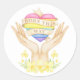 Born this way description in pride rainbow colours heart with two hands holding it in flowers.