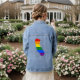 Denim Jacketd with LGBT (lesbian, gay, bisexual, and transgender people) rainbow stripes map of American state of California, gay pride flag design, by pinkbrickroad