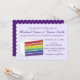Invitations feature an original marker illustration of a slice of rainbow layer wedding cake with white frosting, with purple text and accents. Simply personalise with your information for a unique wedding invitation design. Coordinating stickers, labels, and stamps available!