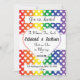 This pride themed wedding invitation is a colourful and unique way to invite family and friends to your upcoming nuptials. Featuring a background of red, yellow, blue, green and purple topped with white hearts, it is a bright and cheery way to announce your love. Names, dates, and addresses can be changed to fit your details. It is a truly unique invitation for the lgbt couple.