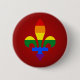 Round Button with fleur-de-lis (fleur-de-lys or lily flower) symbol with rainbow stripes from LGBT lesbian, gay, bisexual, and transgender people) flag, gay pride design on red background