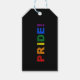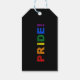 Design with text “Pride!” in colours of LGBT (lesbian, gay, bisexual, and transgender) rainbow stripes pride flag, rainbow love gay pride design on black background