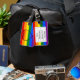 Luggage Tag w/ leather strap with the LGBT pride flag. The rainbow (red, orange, yellow, green, blue, and purple) flag of the LGBT pride movement, with a customisable text template for your name and address