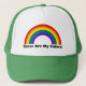 Trucker Hat with LGBT (lesbian, gay, bisexual, and transgender people) rainbow stripes, gay pride flag design, "These Are My Colours" template text, by pinkbrickroad