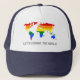 Trucker hat with LGBT (lesbian, gay, bisexual, and transgender people) rainbow stipes map of world, rainbow pride design, Let's Change the World template text, by pinkbrickroad