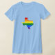 Ladies T-Shirt with LGBT (lesbian, gay, bisexual, and transgender people) rainbow stripes map of American state of Texas, gay pride flag design, by pinkbrickroad