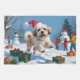 A fluffy Lhasa Apso runs happily through the snowy landscape, wearing a festive red Christmas hat. This cheerful winter scene showcases the breed’s long flowing coat, loyal nature, and playful charm while capturing the warmth and magic of the holiday season. A delightful design full of festive spirit.
