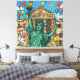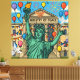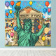 A powerful satirical design : The Statue of Liberty celebrates joyfully in front of the grand Ministry of Peace, surrounded by balloons, fireworks, and festive decorations.