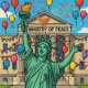 A powerful satirical design : The Statue of Liberty celebrates joyfully in front of the grand Ministry of Peace, surrounded by balloons, fireworks, and festive decorations.