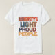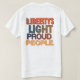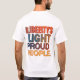 "Liberty's Light Proud People" is a bold and graphic t-shirt design with a mixture of neon and pastel colours. The text is arranged in a dynamic, asymmetrical layout, creating a sense of energy and movement.