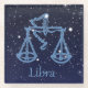 Glass coaster featuring the zodiac symbol for Libra in soft silver blue, overlaid with the stars of the constellation, against a starry sky background graded from deep midnight blue to black.