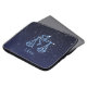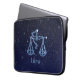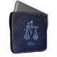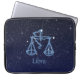 Laptop sleeve featuring the symbol for Libra in soft silver blue, overlaid with the stars of the constellation, against a starry sky background graded from deep midnight blue to black
