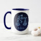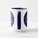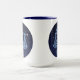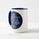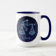 Mug featuring the zodiac symbol for Libra in soft silver blue, as a round medallion, overlaid with the stars of the constellation, against a starry sky background graded from deep midnight blue to black.