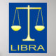 This awesome poster features a digital art image of a pair of golden coloured weighing scales with the word Libra underneath in gold text. A fun design for people celebrating a Birthday born between September 23 and October 22 under the star sign of Libra.