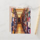 This 2013 calendar postcard takes you on a walk down a long aisle of books in the stacks of a huge library. The bright lighting reveals book spines in a kaleidoscope of colours: red, green, blue, black, white, gold, brown, purple. The symmetrical angle creates a geometric design that seems to lead to infinity. The reflections on the freshly waxed floor contribute to the overall pattern. The reverse has a complete 2013 calendar on one convenient page.