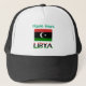 Personalised trucker hat shows the black, red, green and white Libyan flag with the word LIBYA below. Above is a place for a name, your name, to add a personalised look or, someone else's name for a special gift. Wear to your family reunion, if you wish.