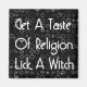 This one has been around for a while: "Get a taste of religion. Lick a Witch." Great way to introduce alternative spiritual choices by making non-witches smile and realise differences are not a threat, but instead help create a diverse, more tolerant world.