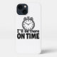 The design has a lie quote "I'll be there on time". You could imagine this being used in a humourous setting, such as on a t-shirt, mug, or poster. This kind of design plays on the universal experience of people who are habitually late, making it relatable and funny.