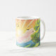 Bees and butterflies hover gently around colourful flowers, their tiny wings shimmering in the sunlight. In the background, a brilliant rainbow arcs across the sky, casting a soft, warm glow over the entire landscape.