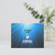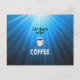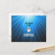 Life Begins after Coffee, blue starburst design, postcard.