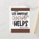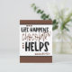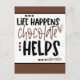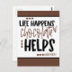 Send someone positive vibes with a touch of humour with the quote Life Happens Chocolate Helps in a mix of black and brown typography with a heart and small square motifs on a white background which can be changed to another colour if you so wish, with borders of chocolate brown at the top and bottom edges trimmed with black.