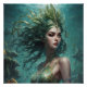 A serene aquatic scene features a woman surrounded by swirling water and fish, her hair flowing gracefully around her. Light filters through the water, highlighting her ethereal and mystical presence.