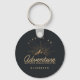 A keychain with a gold coloured illustration on a black-grey background. Designed with an illustration of a mountain with the suns rays shining outward from behind. Typography says: Life is an Adventure explore dream discover.