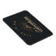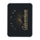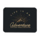 A flexible magnet with a gold coloured illustration on a black-grey background. Designed with an illustration of a mountain with the suns rays shining outward from behind. Typography says: Life is an Adventure explore dream discover.