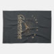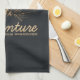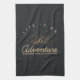 Kitchen towel with a gold coloured illustration on a black-grey background. Designed with an illustration of a mountain with the suns rays shining outward from behind. Typography says: Life is an Adventure explore dream discover.