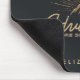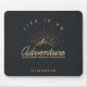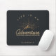 Personalised mouse pad with a gold coloured illustration on a black-grey background. Designed with an illustration of a mountain with the suns rays shining outward from behind. Typography says: Life is an Adventure explore dream discover.