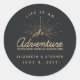 Wedding save the date sticker with a gold coloured illustration on a black-grey background. Designed with an illustration of a mountain with the suns rays shining outward from behind. Typography says: Life is an Adventure explore dream discover.