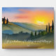 Beautiful tabletop art plaque features an inspiring Rumi quote on watercolor landscape background depicting the rolling hills of Tuscany at Sunset.