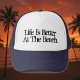 Life is better at the beach beige brown trucker hat for fishing and more.