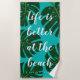 Life is better at the beach monstera palm leaf custom beach towel. Cool handlettered brush script typography print for humourous quote. Unique summer Holiday gift ideas for men, women and kids. Turquoise blue or custom background colour. Large size for beach or pool. Create your own extra large towels for best friends, retiree, retired person, pensioner, family, husband, wife, co worker, colleague, fun boss, employee, mum, dad, sister, brother, aunt, uncle, grandpa, grandma, manager, teacher, nurse, coach, teammate, office worker, swimmer, traveller, son , daughter, teenager, vacationer, wedding couple, newly weds, newlyweds, bride and groom, mr and mrs, honeymooners etc. Big letter text template. Elegant handlettering calligraphy with pretty swirly letters. Personalise with his or her name at the bottom. Beautiful big green tropical palm tree leaves pattern. Exotic floral print design.
