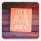 Relaxation on the beach with a drink in your hand and your toes in the sand. This orange sign says it all. Palm trees and all with a nice wood back ground.