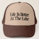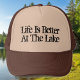 Life is better at the lake beige brown trucker hat for fishing and more.