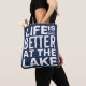 Our lakeside-chic tote bag features "Life is Better at the Lake" in modern white block typography on a rich navy blue background.