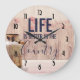 A kitchen clock with a rustic country design. An old rusting milk can. Wheat and faded red poppies in the background set against a faint wood panel. Wood is just an image, not real. Text says Life is better in the country.
