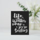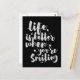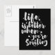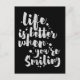 Inspirational postcard displaying the phrase "Life is better when you're Smiling" in white brush script with an organic ink texture to achieve an authentic, hand lettered look.