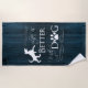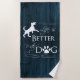 The Life is better with a Dog Beach Towel features text that says "Life is better with a Dog." with a paw print and dog silhouette embellishment against a deep blue rustic wooden background. Additional gift items available with this design as well.